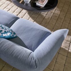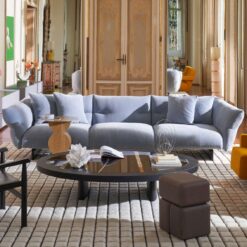 A generous, welcoming refuge that celebrates comfort and hospitality. Designed by Patricia Urquiola, Mon-Cloud is an extremely elegant, versatile sofa, studied to rethink upholstered furniture design with an eye to circularity. The wooden structure lifts the upholstered parts off the floor, lending the entire sofa the lightness of a cloud. The fabric upholstery envelops the contours of the sofa, creating a distinctive fold that enhances the beauty of its silhouette. The eco-minded core of the sofa is composed of a metal skeleton wrapped in quilted recycled PET fibre padding that embraces the backrest and armrest structures like an enveloping comforter. Even the soft seat cushions are made of recycled PET. Mon-Cloud contains an extremely low percentage of foamed elements made of CIRCULARREFOAM®, a polyurethane made with a percentage of recycled polyols. These inserts were developed so they could be separated from the other materials to facilitate their recovery and recycling. Since there are no glued parts, the sofa can be completely disassembled at the end of its life cycle. Mon-Cloud expands the collection with a new, more ample, corner seating module with open end pieces, an ottoman, a bench and an armchair, creating a fresh new living system suited to any contemporary lifestyle.