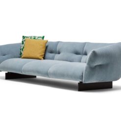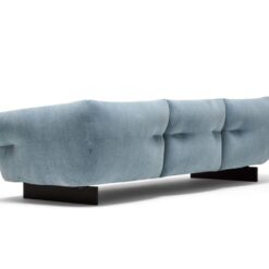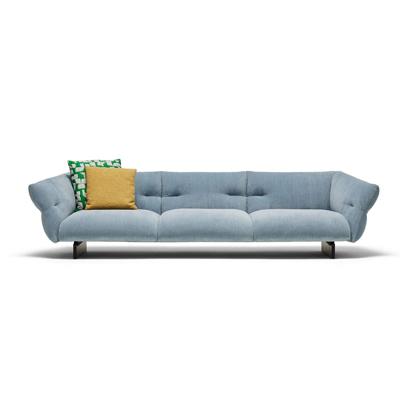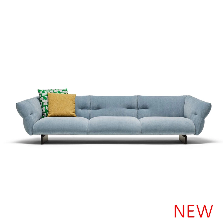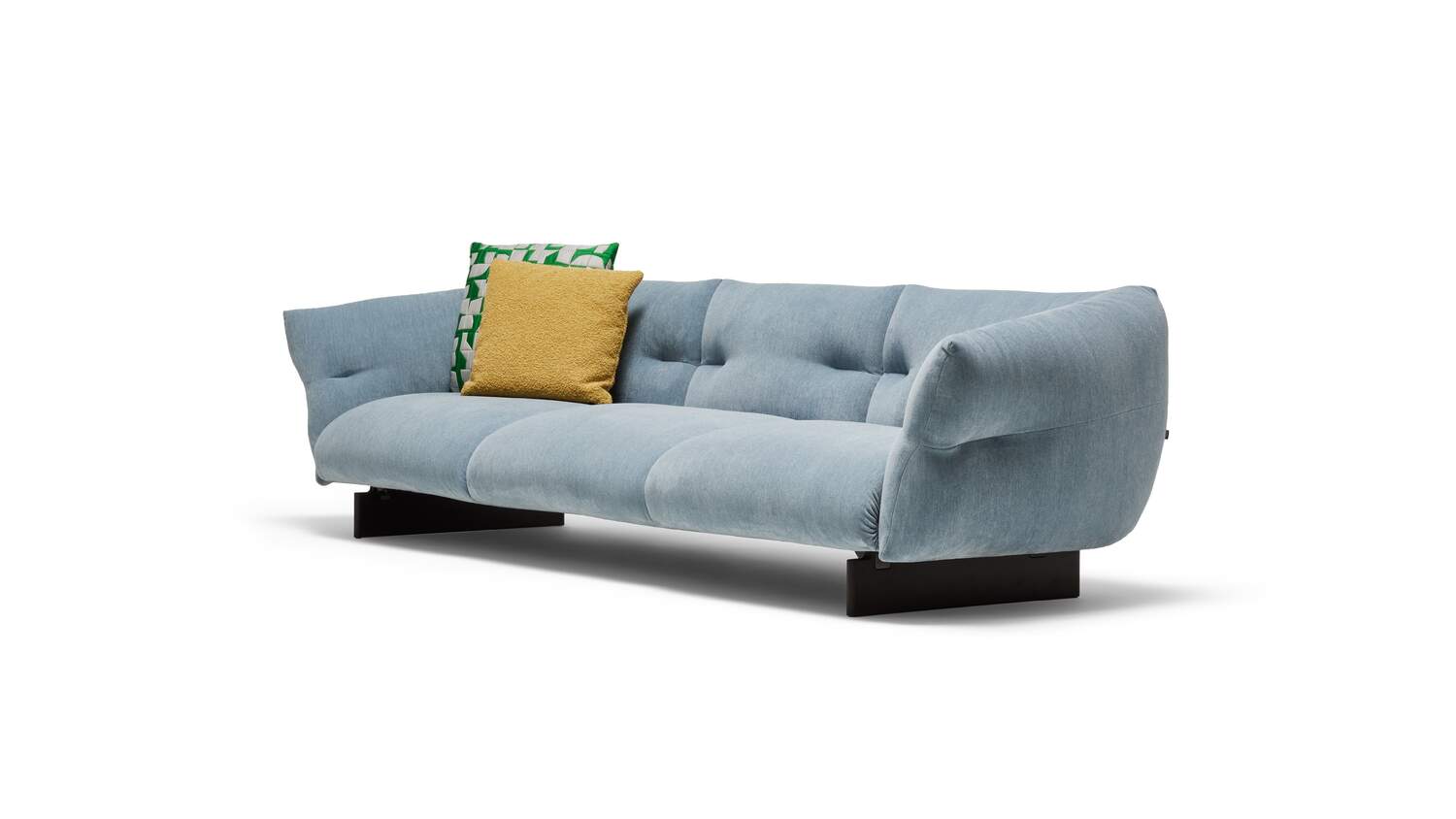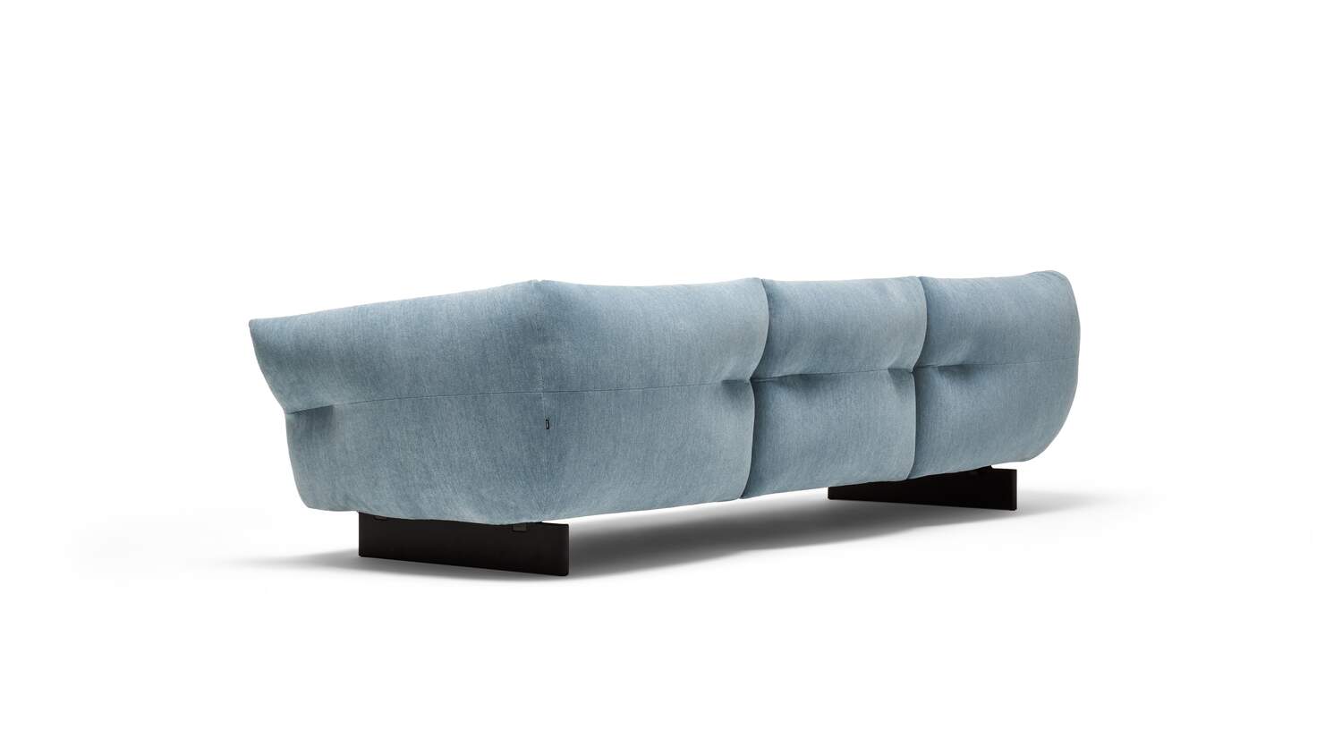 A generous, welcoming refuge that celebrates comfort and hospitality. Designed by Patricia Urquiola, Mon-Cloud is an extremely elegant, versatile sofa, studied to rethink upholstered furniture design with an eye to circularity. The wooden structure lifts the upholstered parts off the floor, lending the entire sofa the lightness of a cloud. The fabric upholstery envelops the contours of the sofa, creating a distinctive fold that enhances the beauty of its silhouette. The eco-minded core of the sofa is composed of a metal skeleton wrapped in quilted recycled PET fibre padding that embraces the backrest and armrest structures like an enveloping comforter. Even the soft seat cushions are made of recycled PET. Mon-Cloud contains an extremely low percentage of foamed elements made of CIRCULARREFOAM®, a polyurethane made with a percentage of recycled polyols. These inserts were developed so they could be separated from the other materials to facilitate their recovery and recycling. Since there are no glued parts, the sofa can be completely disassembled at the end of its life cycle. Mon-Cloud expands the collection with a new, more ample, corner seating module with open end pieces, an ottoman, a bench and an armchair, creating a fresh new living system suited to any contemporary lifestyle.