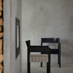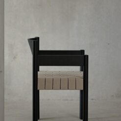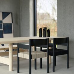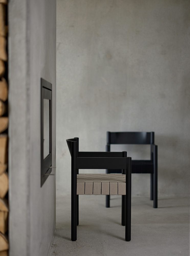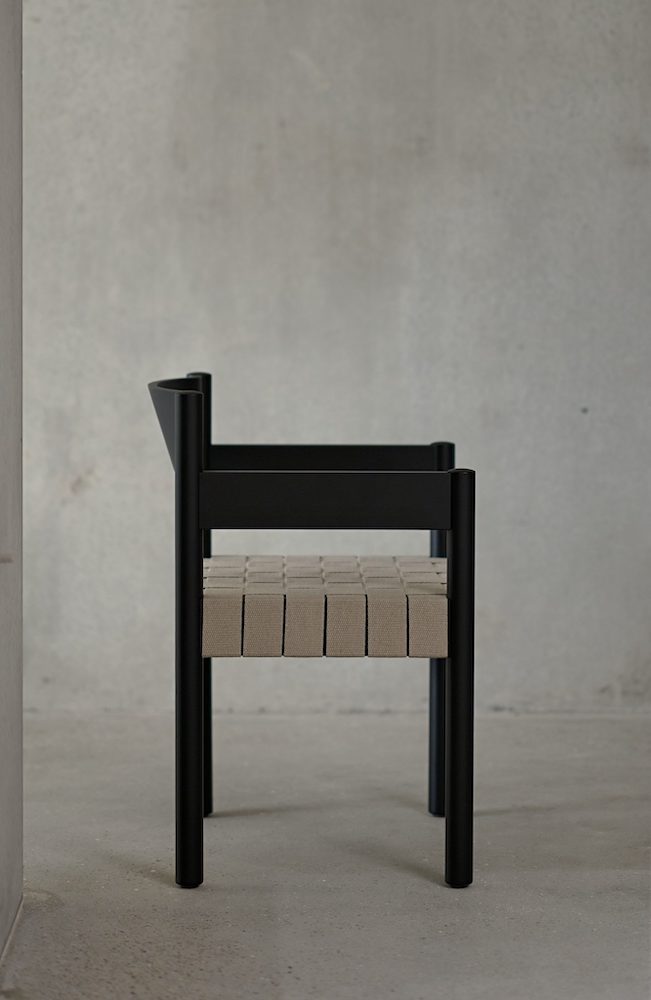 The chair is produced in Denmark, and is available with or without armrests. The chair is made of stained and painted FSC-certified beech from Northern Europe with a seat woven in black or natural-coloured cord made from 90% recycled cotton.