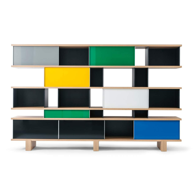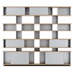 These units can be combined with others so they can serve myriad purposes in myriad settings, creating new combinations: from sideboards to cupboards, from book-shelves against a wall or wall-hung, to free-standing units that can serve as room dividers. Meanwhile, the cabinets, which are available in anodised aluminium in a wide array of colours, interact with the open shelves in a delightful interplay of volumes and voids.