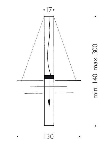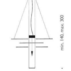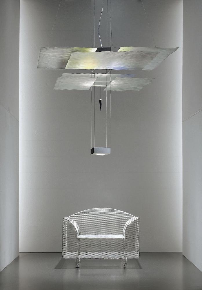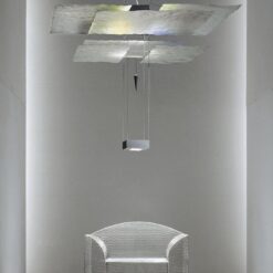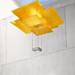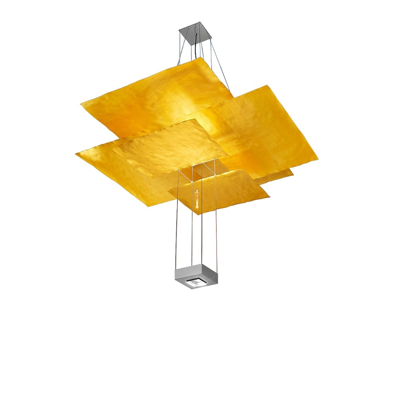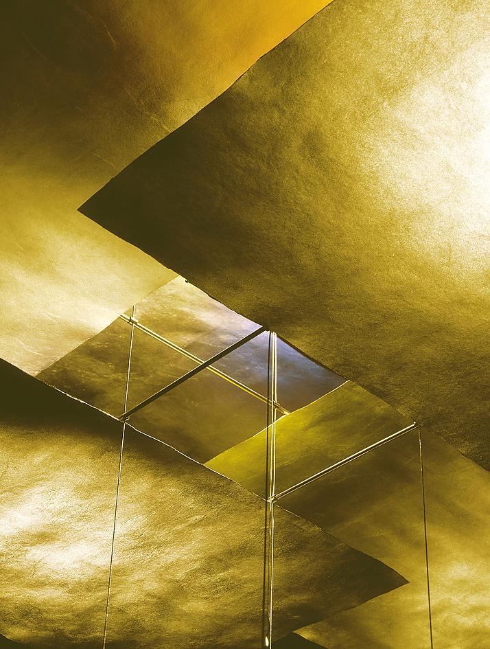 Six sheets of gilded paper. Plexiglass plumb bob. Kabir is the Arabic word for ‘big’. In addition to its size, Oh mei ma Kabir differs from its little sister Oh mei ma in that it has an additional downlight at the bottom. The six sails are also made of Japanese paper and are gold-plated by hand using a special process. The light from the upper lighting element shines downwards onto a reflector plate and is projected back onto the sails. The light reflected by a total of almost 7 square metres of gold leaf gives high rooms a special glow.