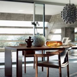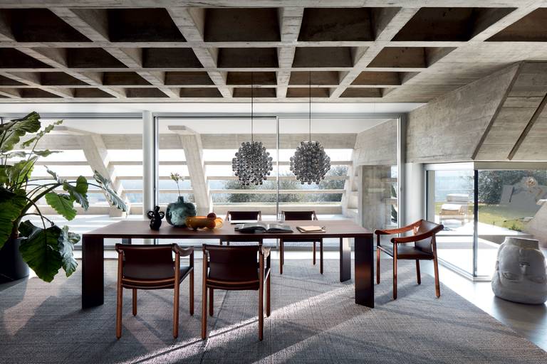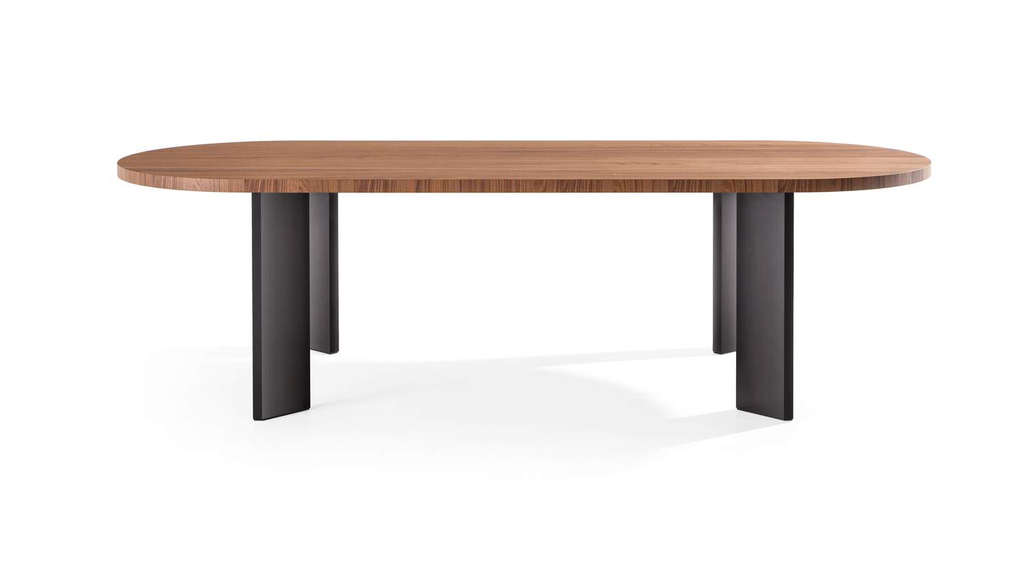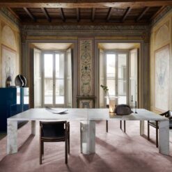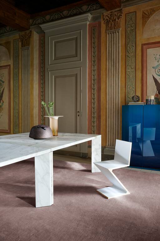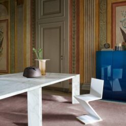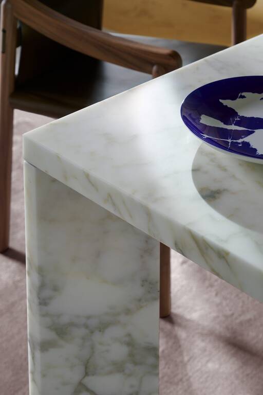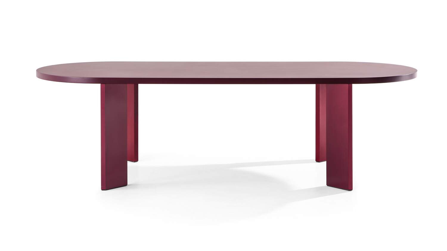A collection of contemporary, sculptural dining tables, where the designer’s expertise in metalwork comes together with Cassina’s artisan skills and excellence in joinery. Its clean, minimalist design pairs a super-slim wood top with slender legs in wood or anodized or painted aluminum, placed on the diagonal at the ends of the table to allow more space for the diners. An extraordinary challenge for the company’s Research Center that rose to the occasion with an innovative solution that combines stability, strength and pared-down thicknesses. The line includes two square versions, one oval with lacquer or veneer top and two rectangular versions, one mono-finish in all-marble, or with the top in marble and the legs in aluminum, which adds to the sculptural beauty of the collection. The models with veneer top have an opulent solid wood perimeter.