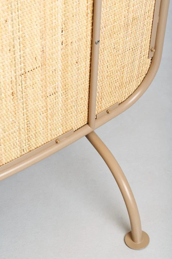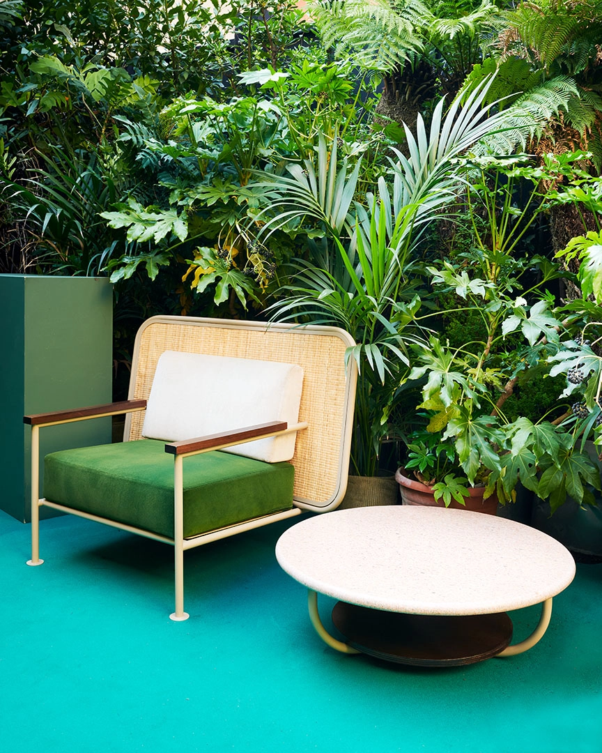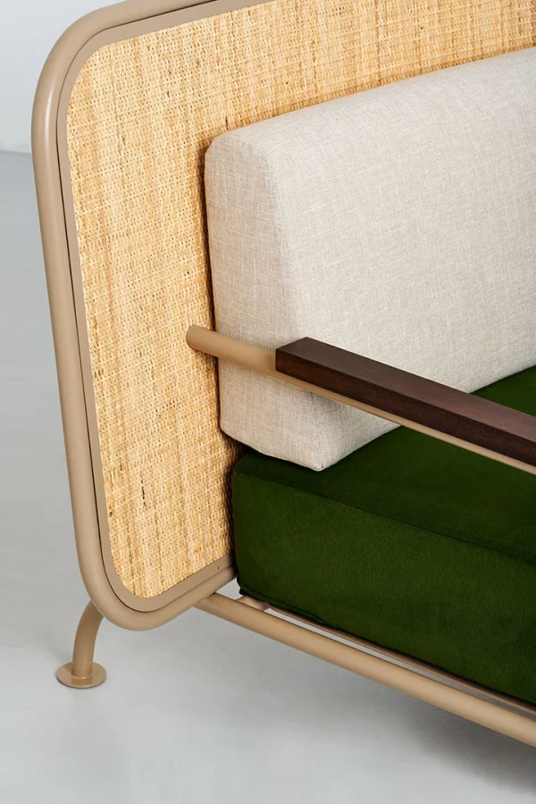 Parterre is a series of patio outdoor furniture that blends contemporary lines with refined traditional accents. Comprising a sofa, armchair, side table and coffee tables, each piece features a tubular metal frame with clean, fluid contours. The backrests are crafted in woven natural straw, evoking the charm of 19th-century wickerwork while adding texture and warmth. Cushions on the seating elements are upholstered in durable velvet, specially designed for outdoor use, while the tables are finished with elegant pink granite tops that lend a sculptural, tactile quality to the ensemble.