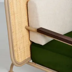 Painted metal structure, solid teak armrests, upholtered with green and beige outdoor velvet.