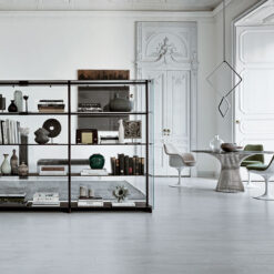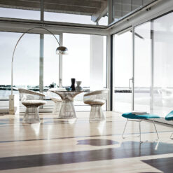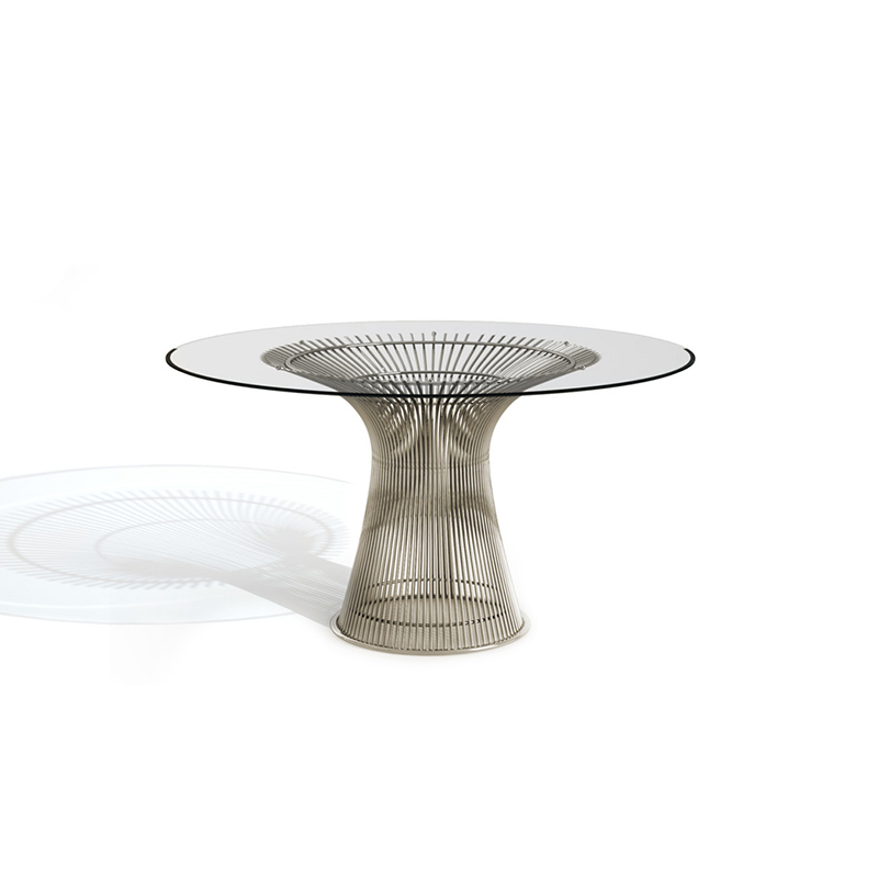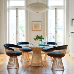 In 1966, the Platner Collection captured the “decorative, gentle, graceful” shapes that were beginning to infiltrate the modern vocabulary. The iconic pieces are created by welding hundreds of curved steel rods to circular frames, simultaneously serving as structure and ornament.