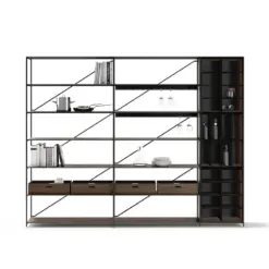 A storage cabinet or an open wardrobe with a linear design, intelligent and simple; the R.I.G. system’s description might as well end here, because it will be completed by many, personal decisions that will transform it into an endless variety of configurations. The minimalist nature of the frame optimises the space and affords the improved organisation of the storage components that complement it. The uncluttered and balanced open shelving improves the closet and furnishes of the sleeping area. The shelf thickness ranges from the pre-existing measures (0.6cm, 1.2cm, 1.9cm, 2.2cm) to the new measure of 3.5cm. Additionally, the bottom shelf can also be placed atop the composition.