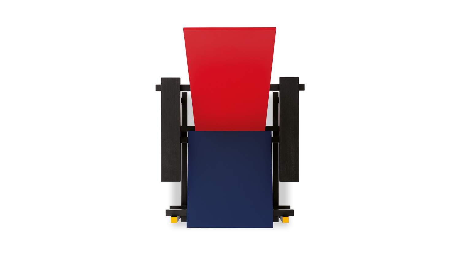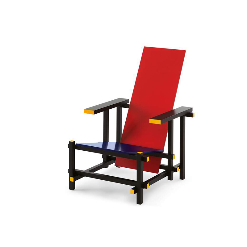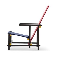 A sculptural seat with a pure and rationalist form, this chair became an authentic Manifesto for Neoplasticism, embraced by the Dutch De Stijl movement in 1917. An outlook shared by Piet Mondrian, whose objective was to seek out the essential nature of things, combined with the harmonious equivalence of colours, and the use of right-angle. Rietveld produced his first prototypes in 1918, expressing the philosophy of organising space using the same colours for similar components. He later applied this same approach to separate out constructional elements according to their function. Thus the base was black, and the seats coloured. As a consequence, the name of the piece changed, from Slat Chair to Red and Blue.