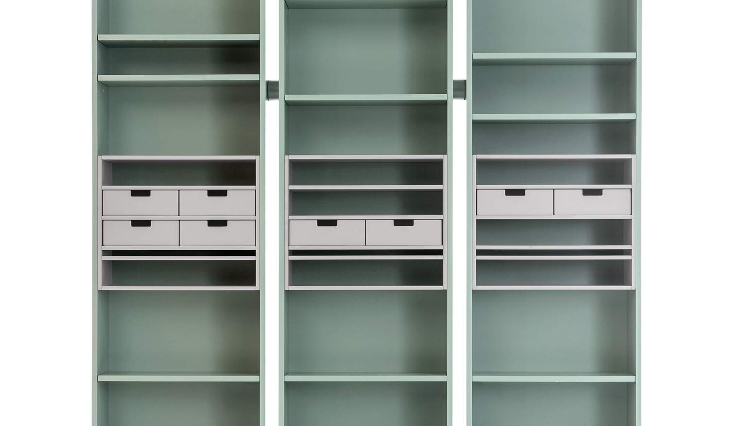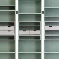 The individual units are linked by a spacer insert. This has become the iconic feature of the design. Almost as distinctive is the central block, which is composed of shelves or small drawers, featuring a matte finish.