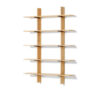 Along with the center block containing painted shelves or small drawers, a spacer insert used to combine elements becomes an iconic feature in the structure of this wood bookcase.