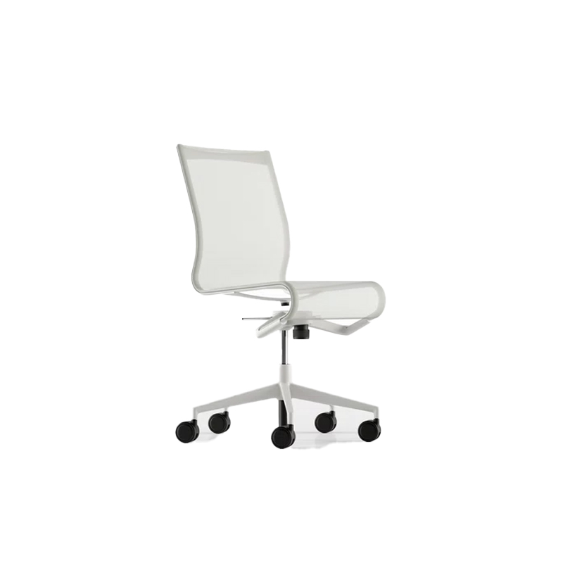 Structure made of extruded aluminium profile and die-cast aluminium elements. Seat and back in PVC covered polyester mesh, in eco-leather Serge Ferrari®, in fabric Camira®, Reviva® or Kvadrat® or in Pelle Frau® leather.