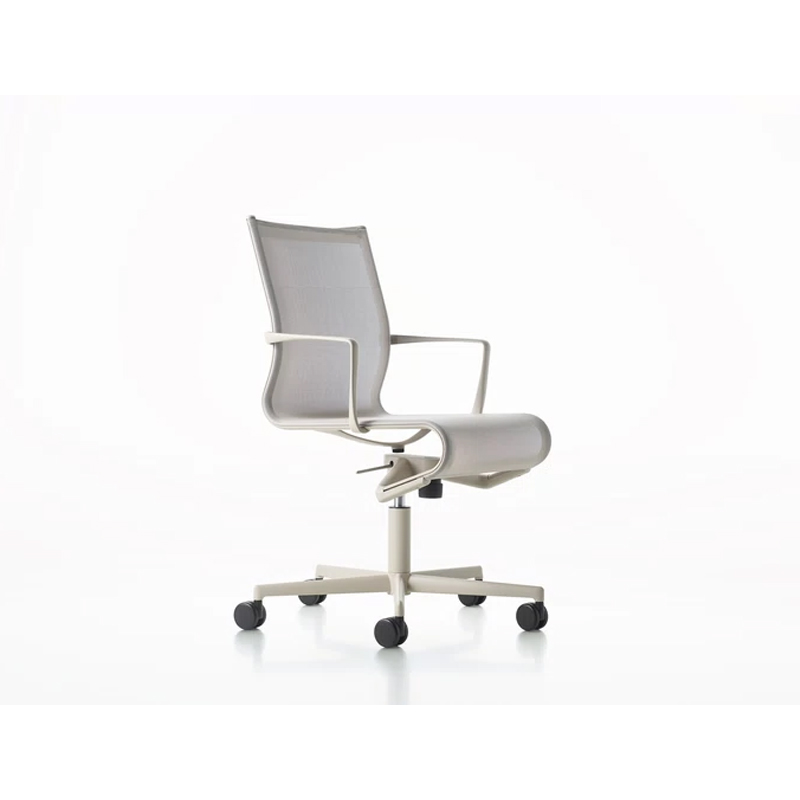 Structure made of extruded aluminium profile and die-cast aluminium elements. Seat and back in PVC covered polyester mesh, in eco-leather Serge Ferrari®, in fabric Camira®, Reviva® or Kvadrat® or in Pelle Frau® leather.
