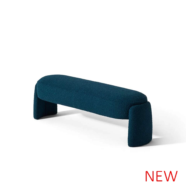 An interplay of overlapping and intersecting surfaces distinguishes the series Ruuna Pouf of three round poufs – and a bench – all padded and upholstered in a selection of fabrics from the catalogue. The parts in polyurethane are made with a percentage of polyols derived from biological sources while the padding is in recycled PET fibre. All materials are easily separated at the end of their life cycle to facilitate the disposal and recycling of the premium parts, starting with the metal core.