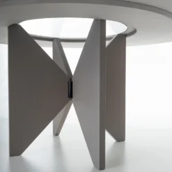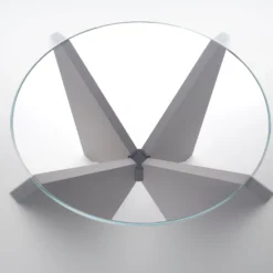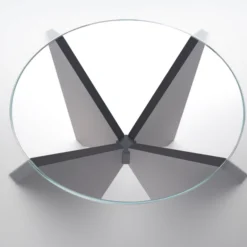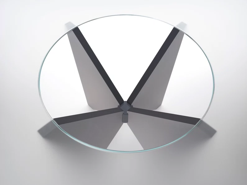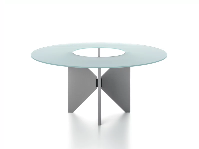 The table top consists of two elements: a laying central round top (always in extra-clear transparent glass) and an external crown available in: