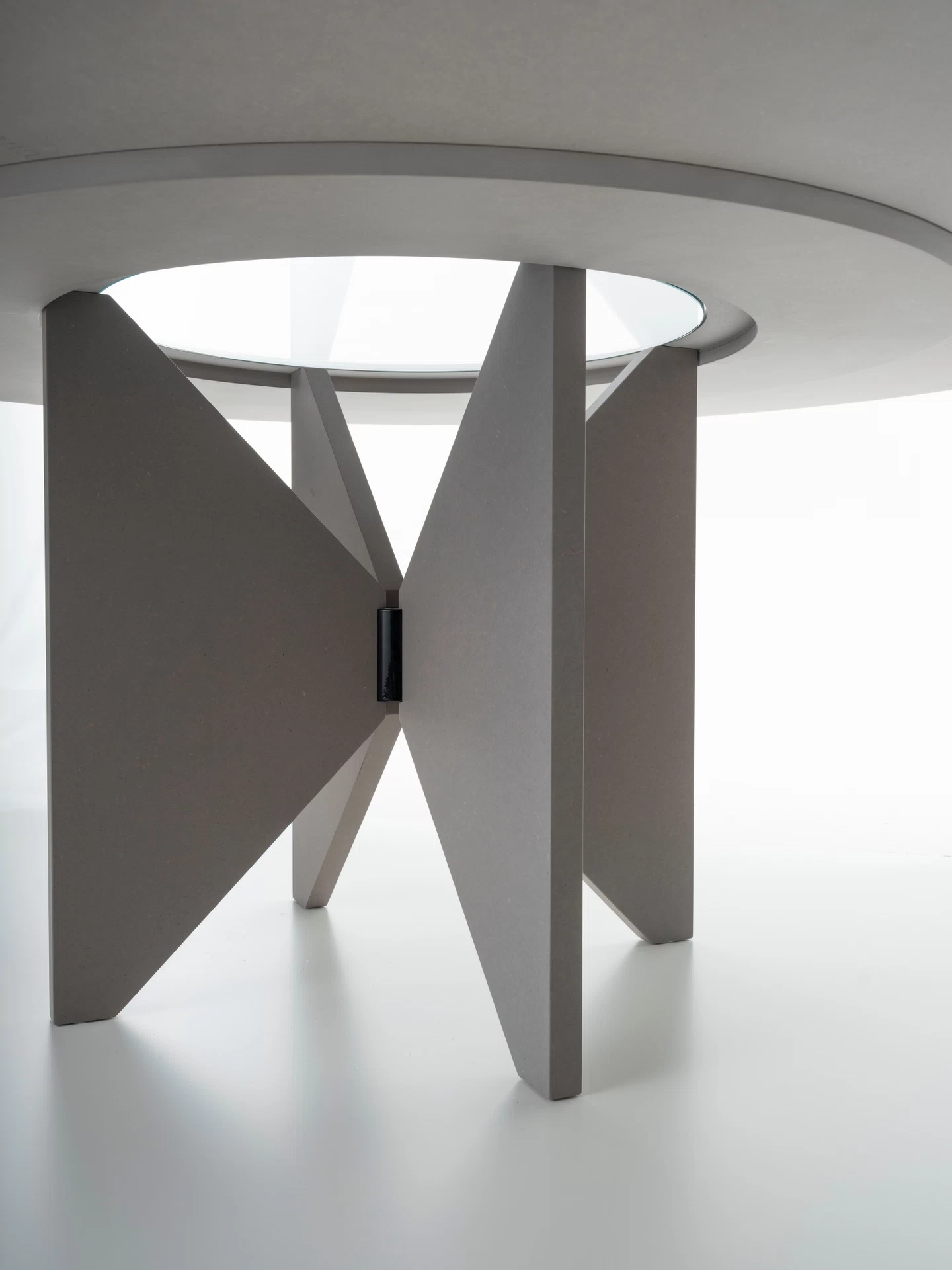 The table is available in the exclusive MB edition: light grey base with black edges, Ø160 acid-etched glass top.