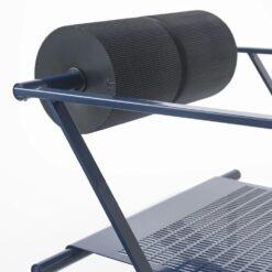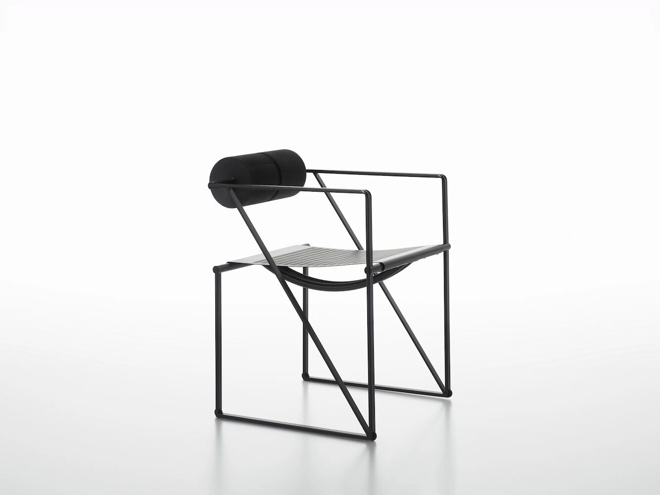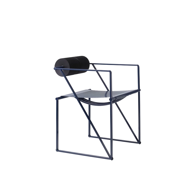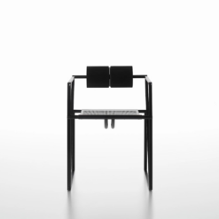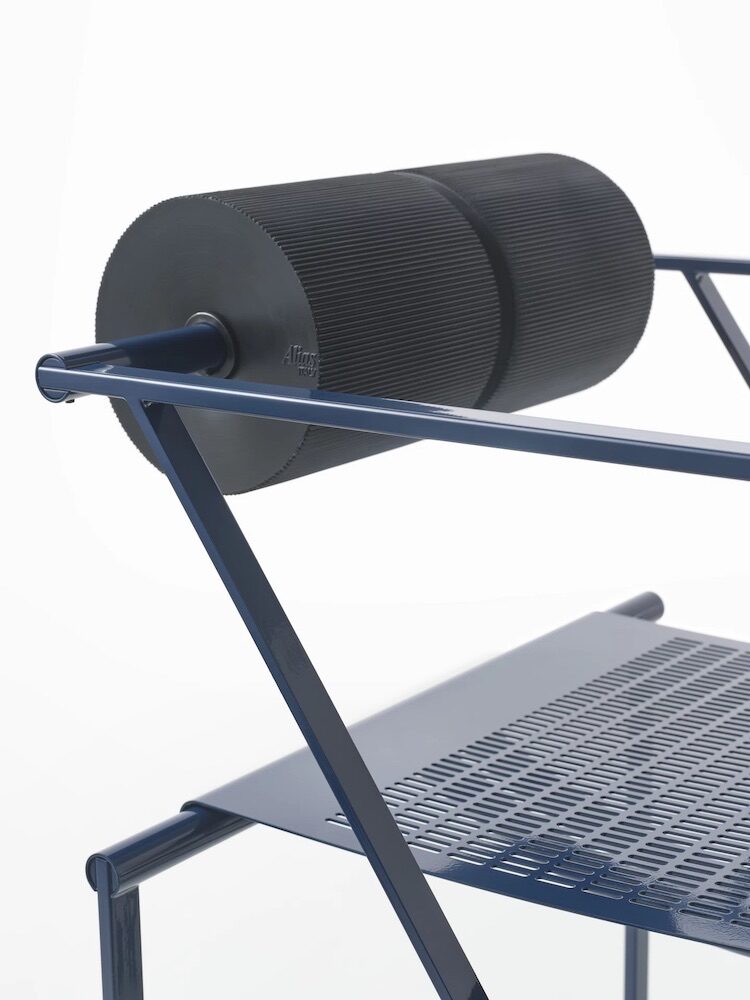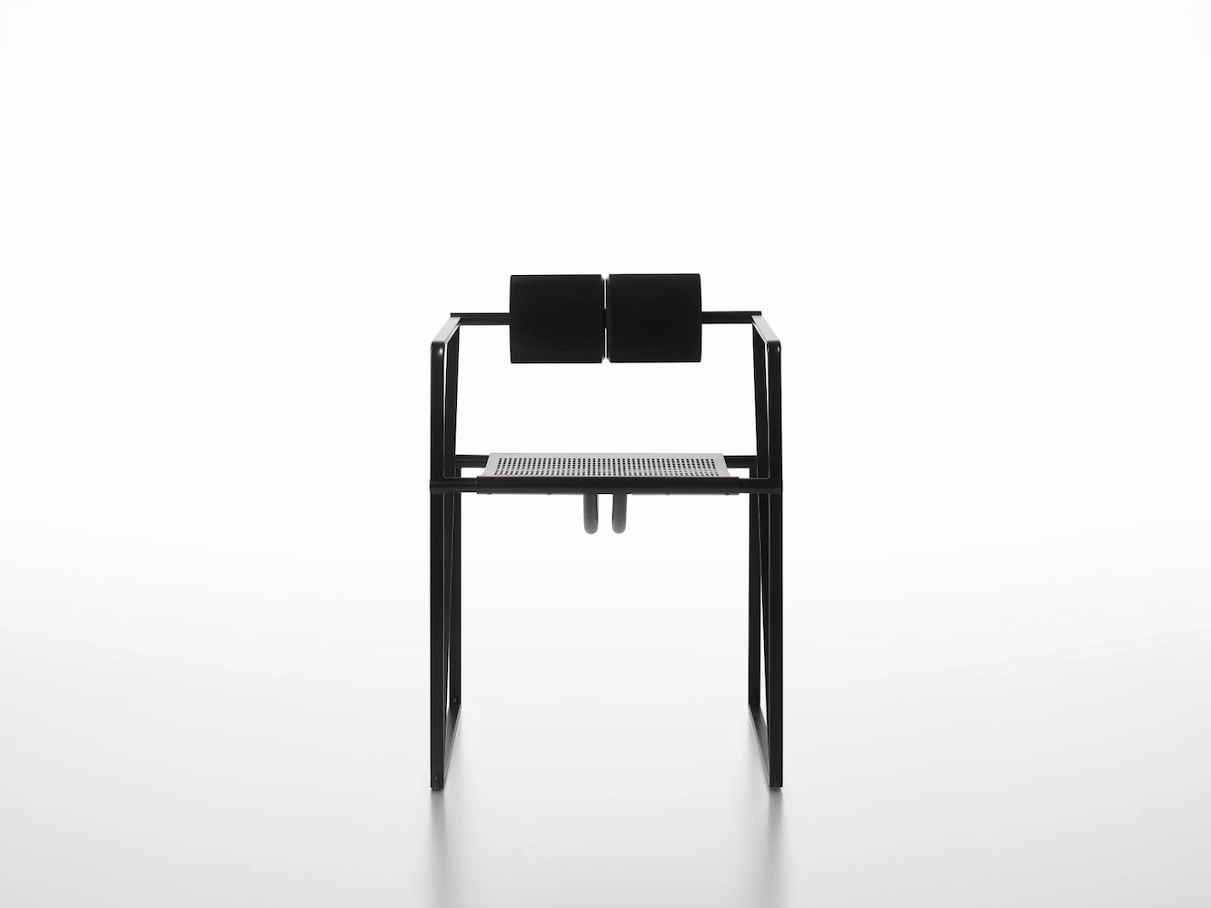 Chair with arms, with structure in lacquered steel, seat in lacquered perforated steel sheet with back consisting of two black polyurethane cylindrical elements.