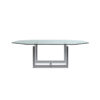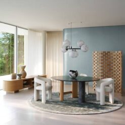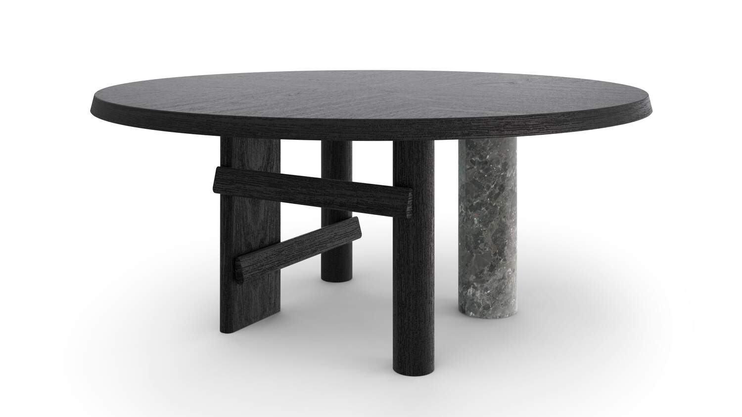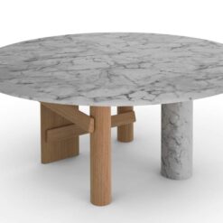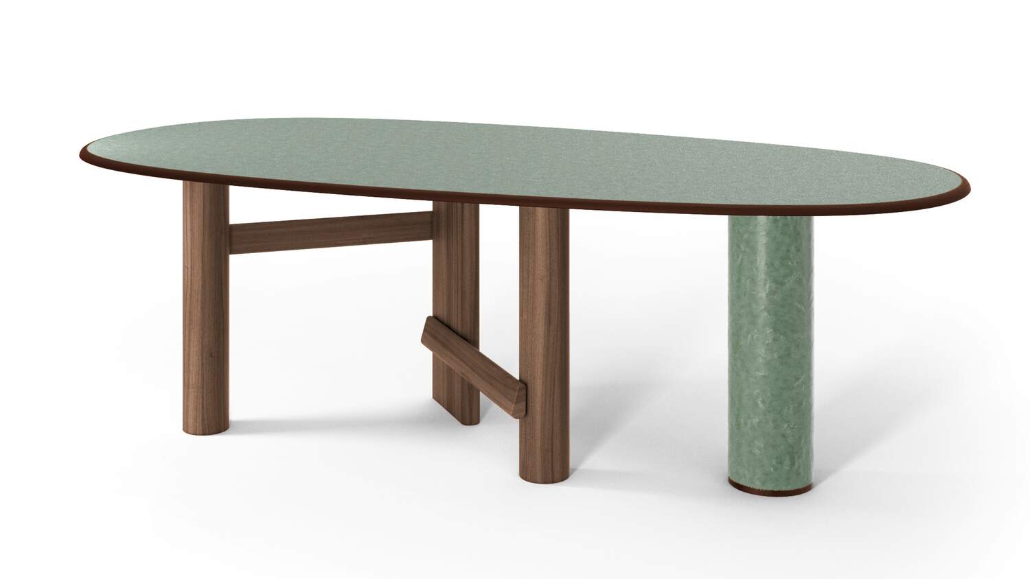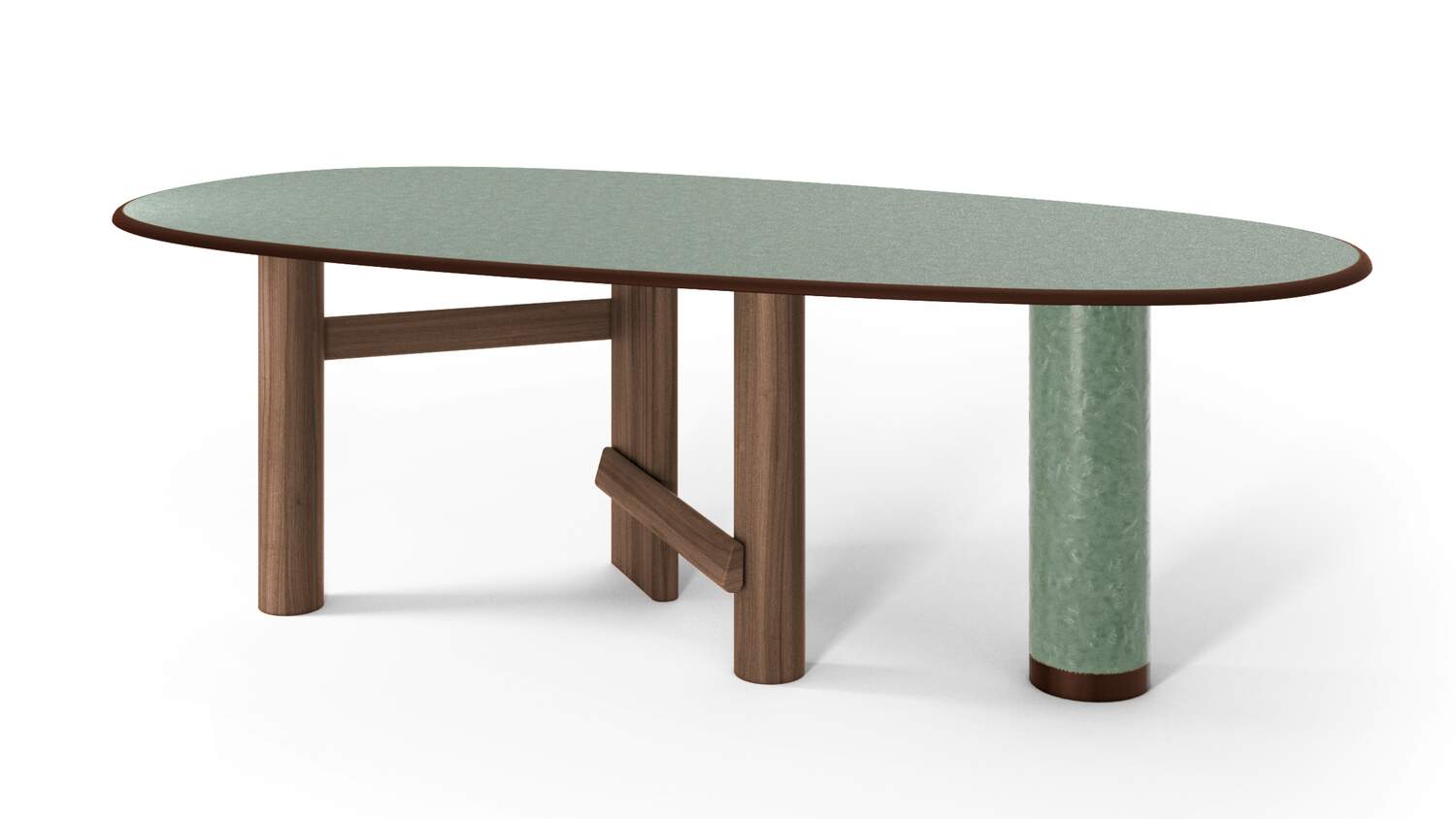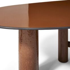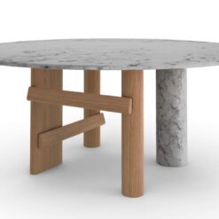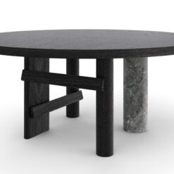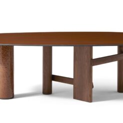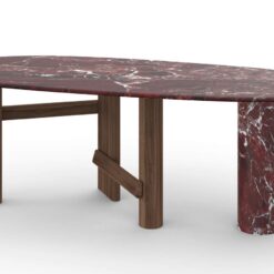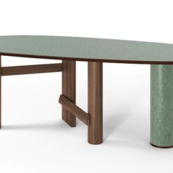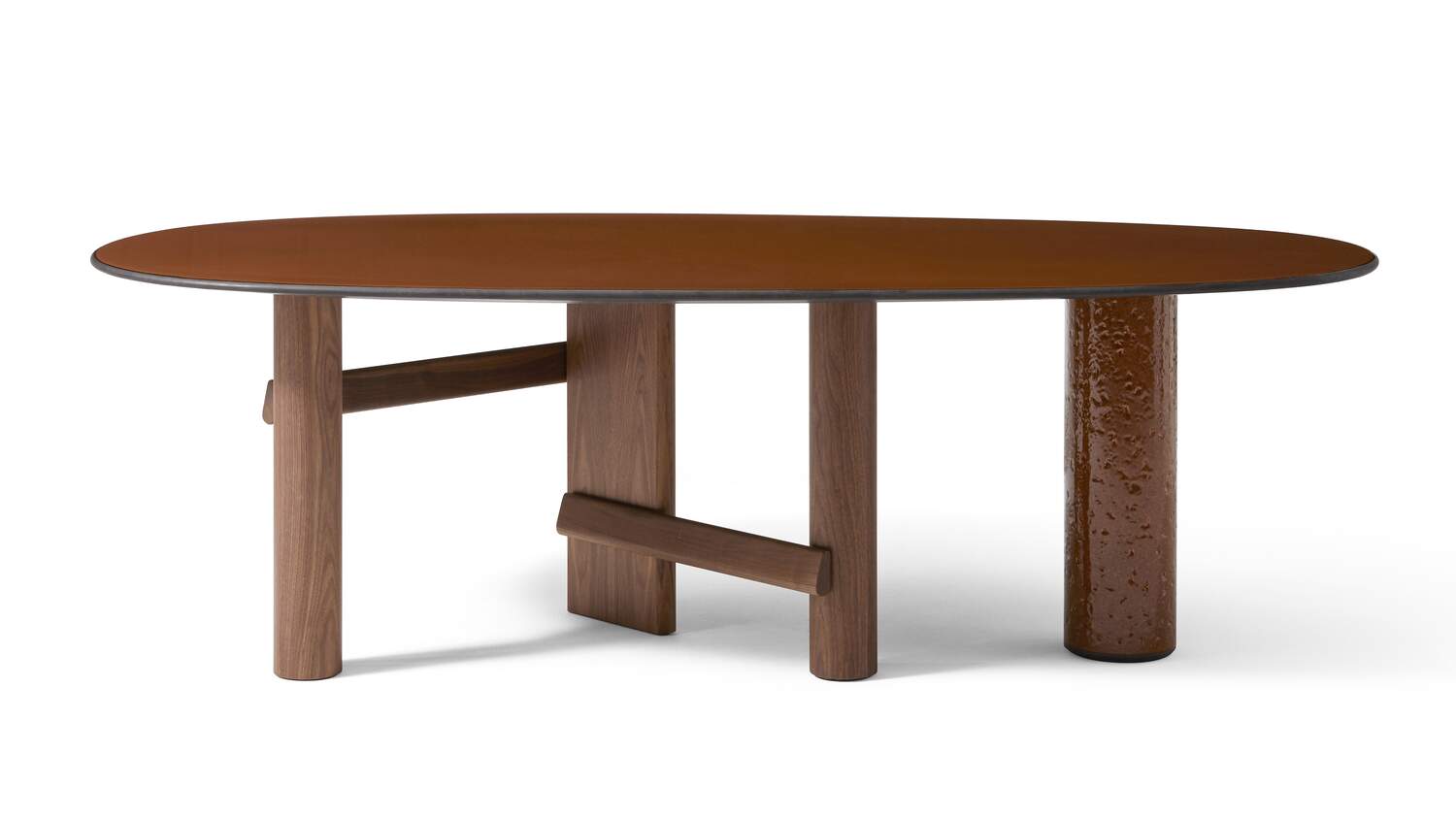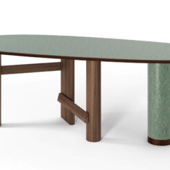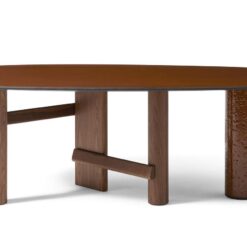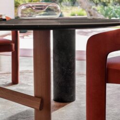 The oval and round table is characterized by a solid wood structure with an oval leg which is connected by one or two crosspieces to the two cylindrical legs. The top is in the same wood essence as the structure – Canaletto walnut, natural oak or stained black oak – or combined with a cylindrical column of strong presence available in a selection of marbles and coloured ceramics.