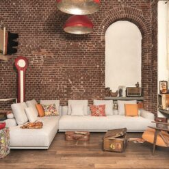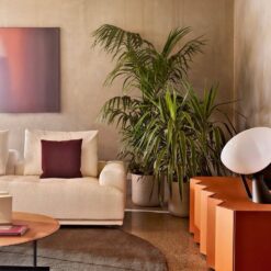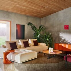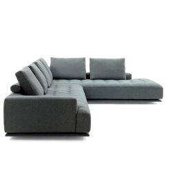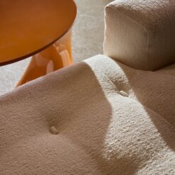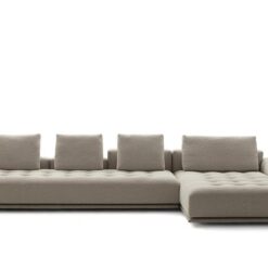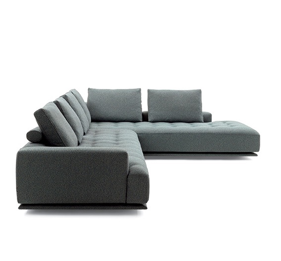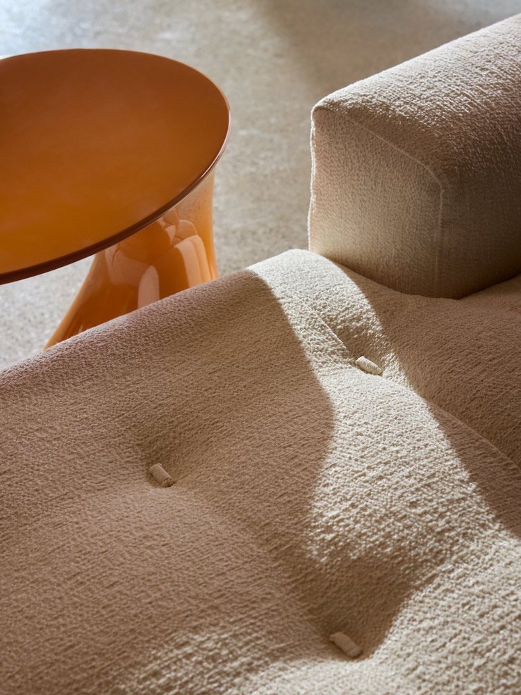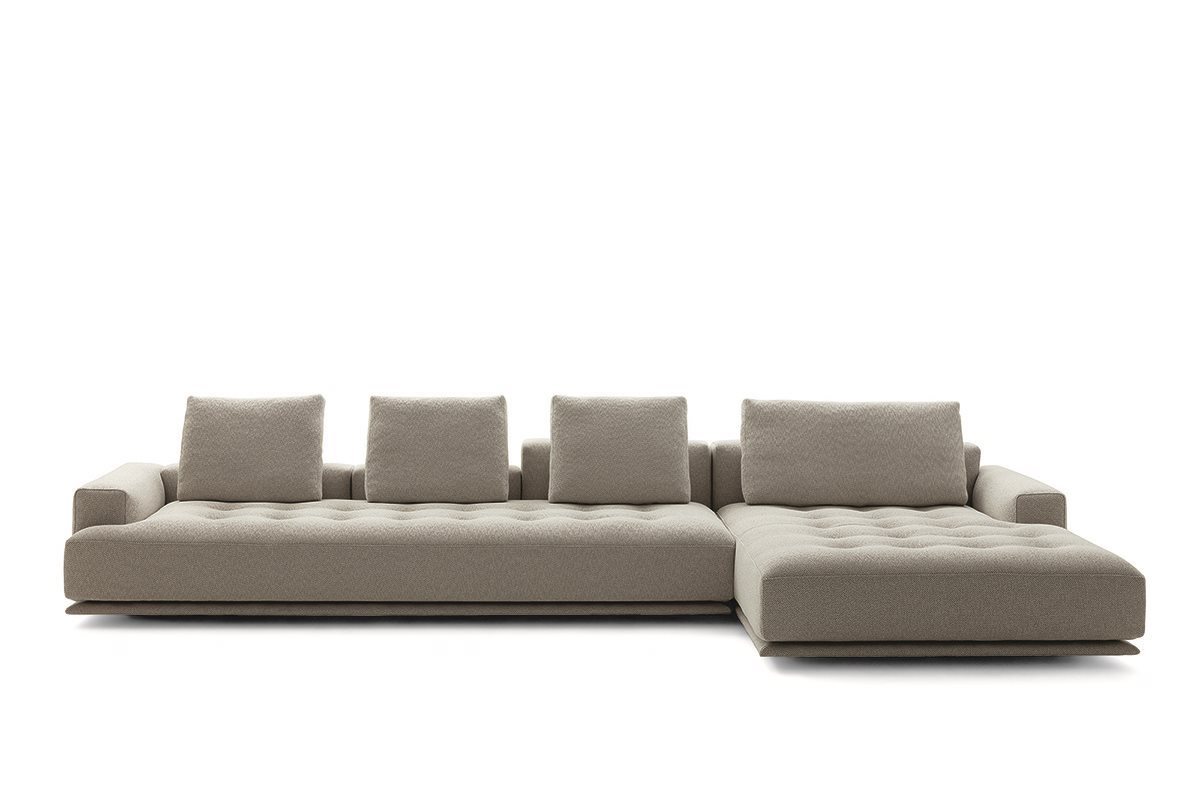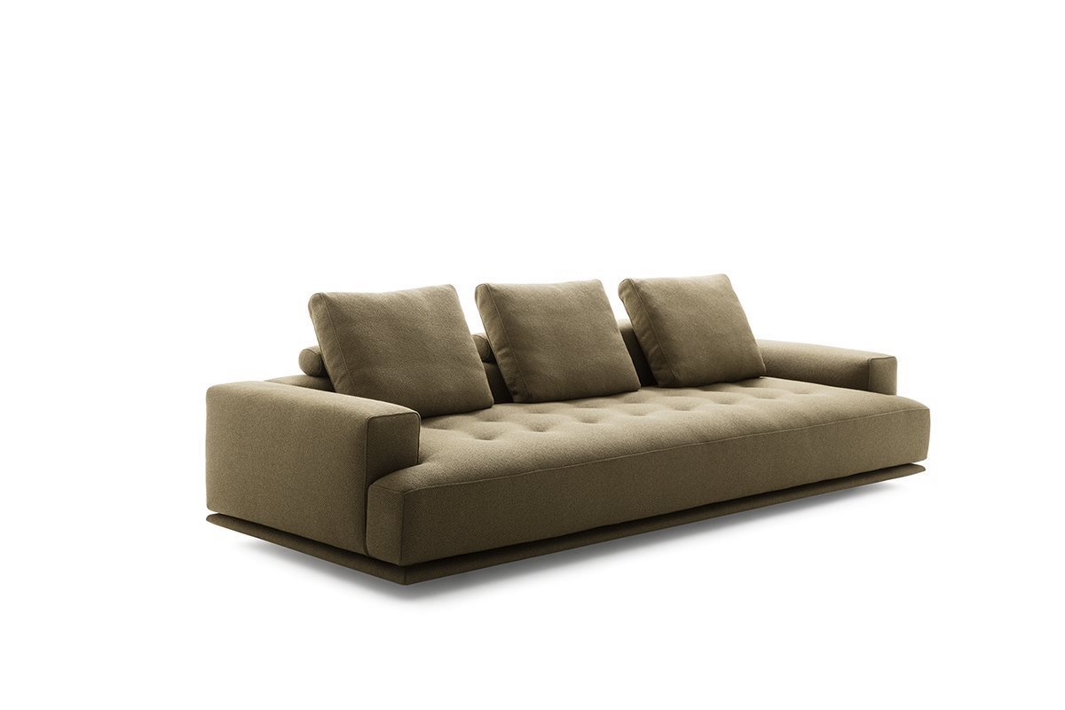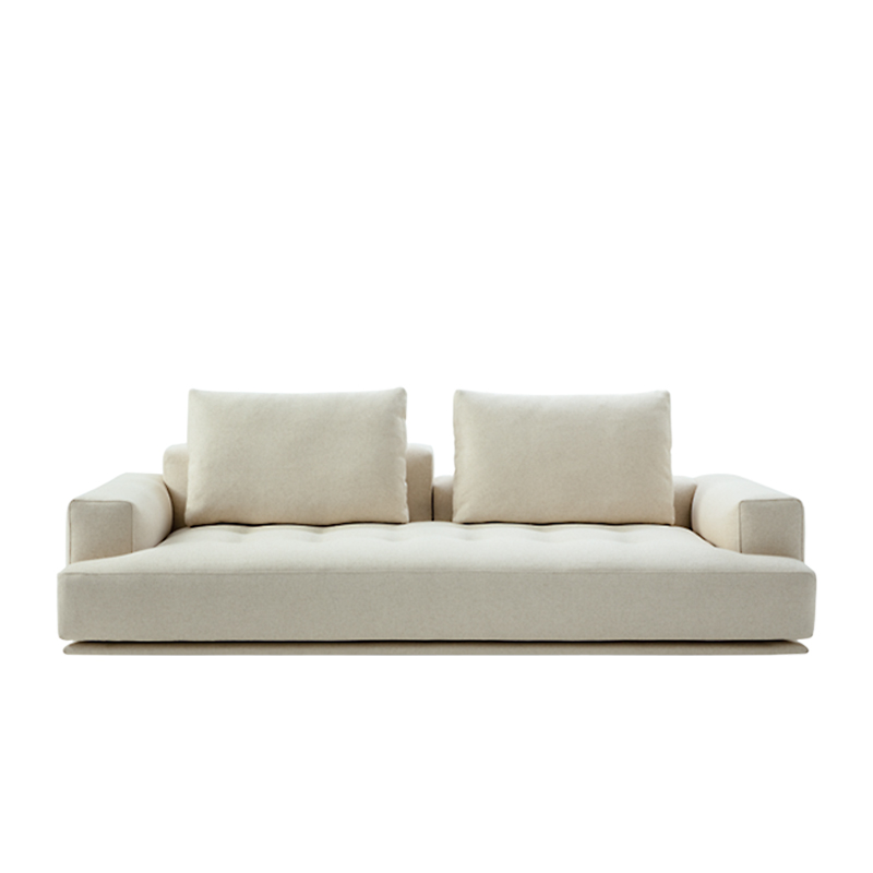 Inspired by the spare simplicity of the traditional Japanese futon, this sofa evokes the appearance of a thick padded mattress resting upon an upholstered wood base. The refined, quilted motif delimits the generous seat cushion, embellished by the sartorial detail of hand-made toggles in nuanced shades of the upholstery. The design is characterised by the dynamic alternation of different thicknesses and heights, mimicking an urban skyline, an architectural composition created from harmoniously contrasting materials, finishes and volumes.