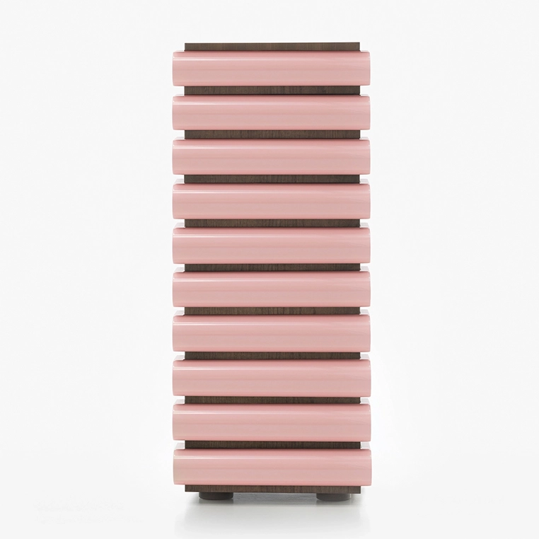 A playful and spirited pillar of drawers, the Storet chest of drawers epitomises the visionary touch of Nanda Vigo designs. In both its elongated vertical edition, and in the nightstand version, the Storet reflects today’s advances in production, with the walnut’s visible grain illuminating Acerbis’s modern expertise in utilizing extensive wood surfaces. Made of black ash, dark-stained walnut, or in the matt lacquered version, Storet’s vertical structure is paired with glossy lacquered drawers, available in the iconic Acerbis palette and enriched by Fluo Green: a tribute to Nanda Vigo’s installations, where light and fluorescent colors redefined the perception of space, transforming it into a sensory and dynamic experience.