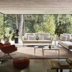 Classic seat cushions, soft and tufted: polyurethane foam core and chamber cushion overlay (filled with polyurethane foam lozenges, latex and a mix of goose feathers and down).