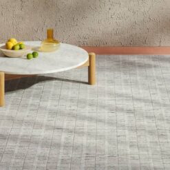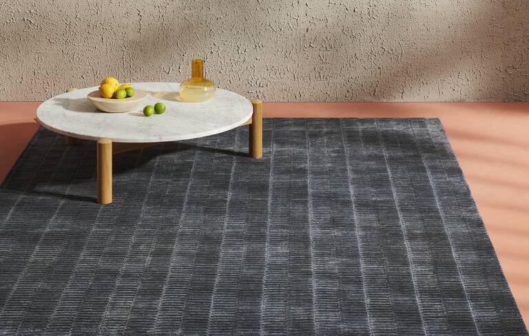 The Tantra rug stems from the hand loom technique, in which production is carried out on a loom using entirely manual processes. Its geometric pattern, obtained by repeating a simple pattern memorized by the weaver, recalls the rigorous and accurate decorations that can be seen in many Indian temples where colour is used in a formal manner. Available in grey and blue-grey in a yarn made with a mix of viscose and recycled PET.