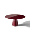 The choice of materials respects the philosophy of the design: back-lacquered glass or lacquered MDF for the tabletop and rigid plant-based polyurethane with a percentage of polyols derived from biological sources for the base, which is tri-lobed in shape for the round tops and an infinity shape for the oval tables. Available in a palette of warm, earthy tone-on-tone colours and also in a coffee table version.