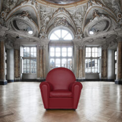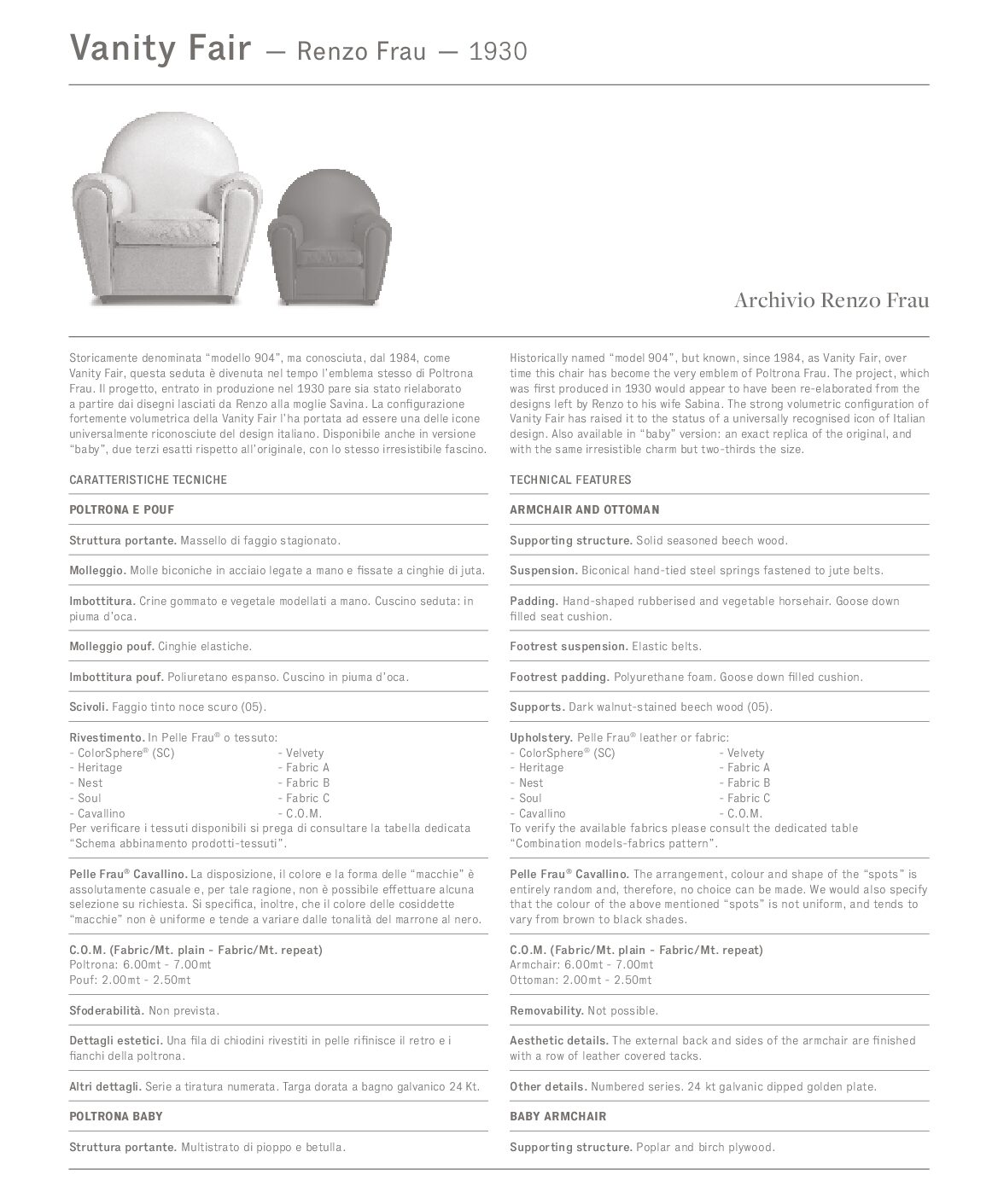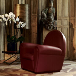 It is thought that the project, which first went into production in 1930, was developed on the basis of designs that Renzo Frau left his wife, Savina. The deliberately volumetric configuration of the Vanity Fair armchair saw it become one of the universal icons of Italian design. Also available in a “baby” version, exactly two thirds the size of the original, Vanity Fair is also a comfortable pouf.