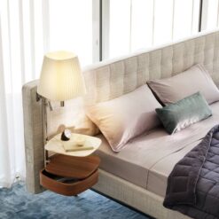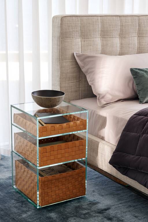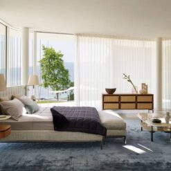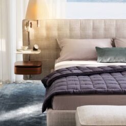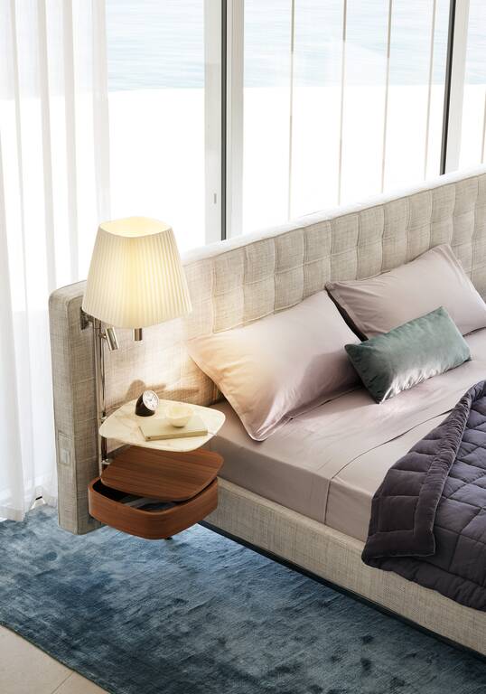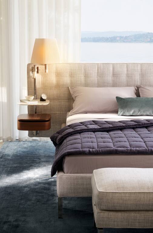 A hotel suite in the bedroom. Volage EX-S Night bed has the starring role in the concept by Philippe Starck that transforms the private zone into an island to be explored, enhanced by the furnishings of a suite, complete with an armchair and settee. Volage EX-S Night converts rest and wellbeing into a sensory experience of timeless elegance. The sophisticated padded headboard is embellished with capitonné tufted upholstery and can be outfitted with electrical outlets. The elegant bars are equipped with wood or marble shelves that serve as bedside tables and are complete with table lamps and dimmable reading spotlights. The upholstered bedframe is compatible with theBreath® purifying fabric, the first patented technology to purify the air without a power source, with zero emissions, that captures and breaks down contaminants, encouraging the natural circulation of clean air to create a safe, healthy living space. Padding is recycled PET fiber batting.