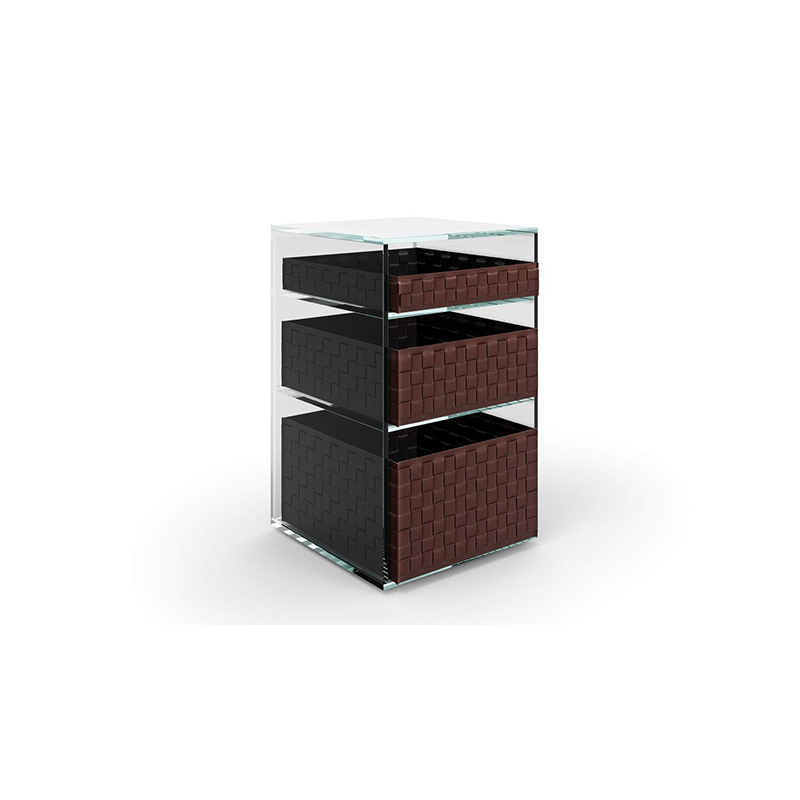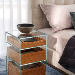 Based on the contrast between materials, the pure elegance of glass meets wicker, saddle-hide and wood in a cabinet with three shelves. A piece of furniture added to the iconic bedside table in extra-clear glass already part of the Cassina collection, the bedside table Volage EX-S Night is the perfect complement for the the concept by Philippe Starck for the nighttime zone that transforms the bedroom into a suite. The structure in extra-clear or smoked tempered glass frames the individual storage trays in hand-woven wicker, hand-woven saddle-hide. The result is a bedside table that puts a new face on storing personal items, making it possible to uniquely and elegantly secure belongings without hiding them.