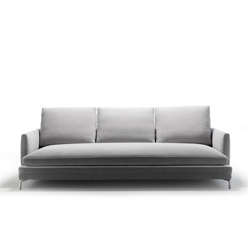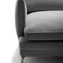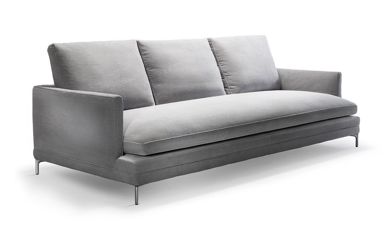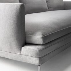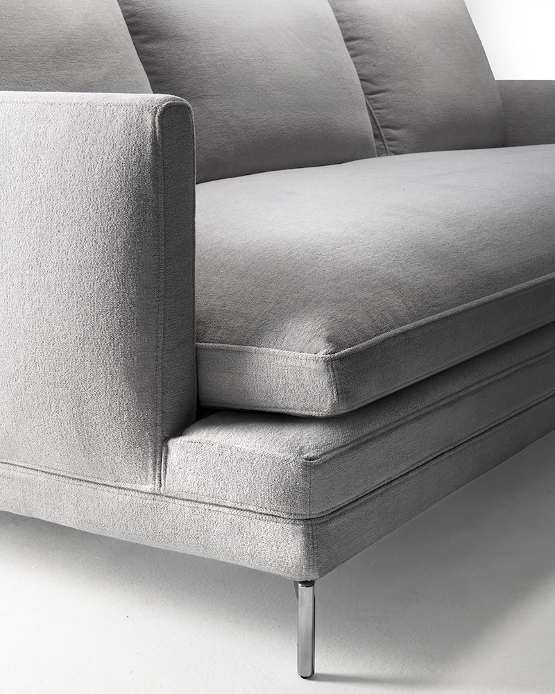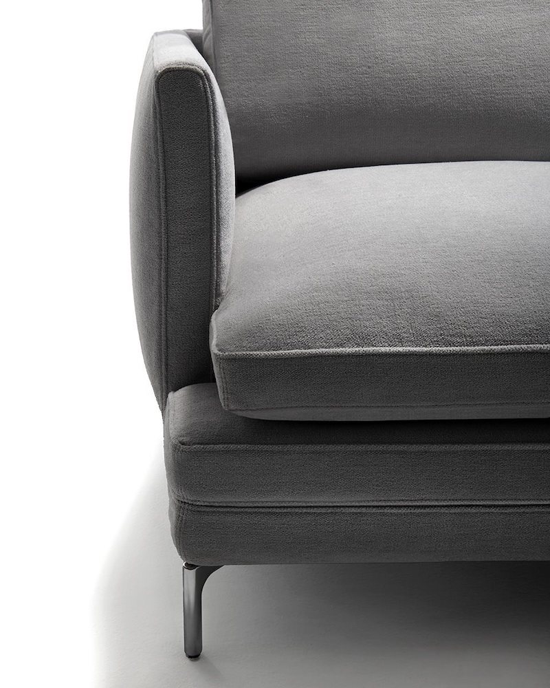 Seat upholstered with graduated polyurethane foam/heat-bound polyester fibre. Upholstery of back and armrest in self-extinguishing polyurethane foam/heat-bound polyester fibre. Seat and back cushions upholstered with regenerated and regenerable polyester balls with graduated polyurethane insert. Removable fabric or leather cover.