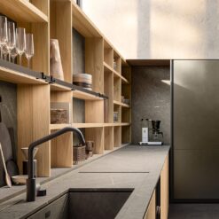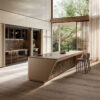 Xila kitchen is now available in the new composite MDI: a high-performance material, made of high-purity minerals soft to the touch, hygienic and nontoxic, highly resistant, made of recycled materials, so totally ecological. The recessed worktop with lowered portion  that includes the built-in equipped track Inside System Top, can have multiple functions thanks to compatibility with Inside accessories, the elegant long hanging bar for ladles or other accessories, equipped with LED lighting and the totally integrated downdraft hood.