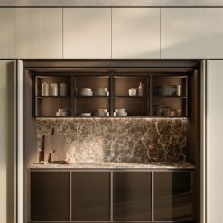 Modular kitchen system designed by Luigi Massoni in 1972, recognized among the masterpieces of Italian design as the first kitchen available without handle. The door opening on the base units is allowed by a shaped aluminium profile (upper handle-rail). The base units, with two or more drawers, can be fitted with a middle handle-rail or a push-opening, giving a minimalist design aspect. The tall units can be opened through vertical aluminium profile spacers on the sides. Worktops, panels and fronts are available in a wide range of finishes. Over the years this kitchen has been updated with new materials, including painted frosted glass (doors and tops) and aluminium (doors), becoming always more sophisticated and textured.