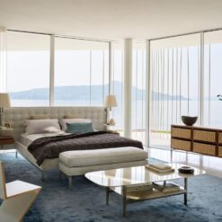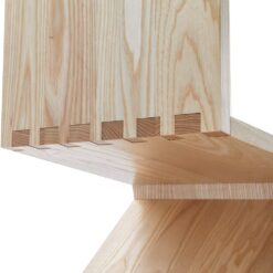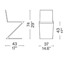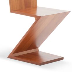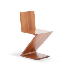 Designed by Gerrit Rietveld, this chair provided an early example of a cantilevered seat, and is composed of four wood boards articulated end-to-end to form an extremely eye-catching example of an unstable structure. Eschewing the traditional legs-seat-back sequence, Rietveld created a ribbon of wood forming a Z-shape. The crafts mastery of Cassina’s carpenters is seen in the execution of the dove-tail joints, which add to the beauty of the piece. The aesthetic uniqueness of this piece can be seen particularly well in the coloured version, its open-pore finish highlighting the veins of the wood on the front and sides. This finish reflects a number of variations on the theme made by Rietveld, designed to highlight the relationship between the vertical, oblique and horizontal lines.
